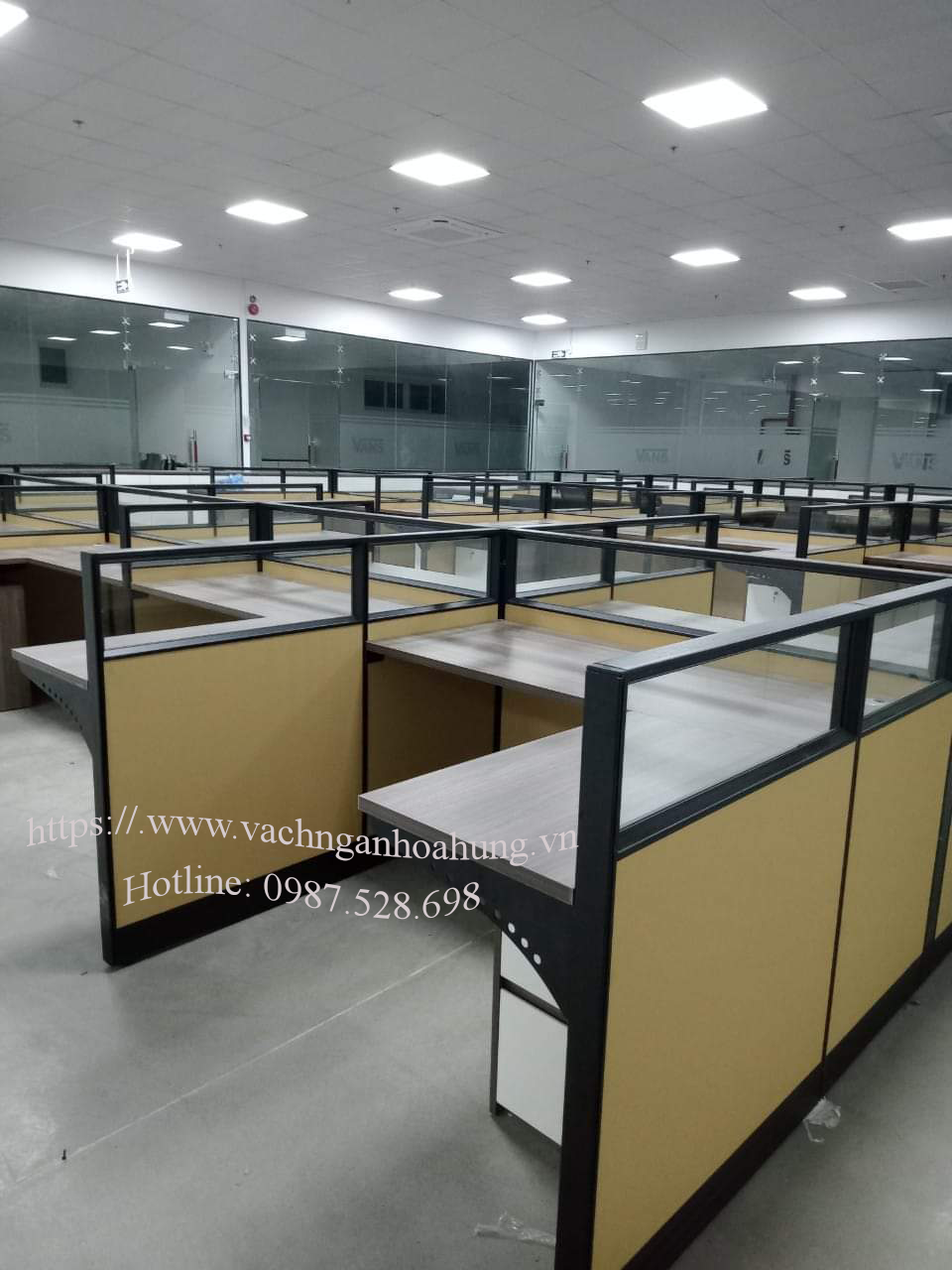 Chất liệu : khung nhôm sơn tĩnh điện Ánh nhôm; vách trên kính trắng 4mm; vách dưới Nỉ; Vách có hộp kỹ thuật để đi dây điện, dây cap... Sử dụng mẫu vách ngăn văn phòng này không những bền đẹp, giá hợp lý là còn rất hợp thời trang.